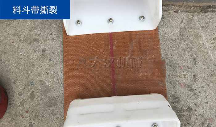提升機(jī)料斗帶通常為帆布帶,有時(shí)也采用膠帶和鏈條。在各種故障的綜合作用下,帆布帶和膠帶容易產(chǎn)生撕裂,這是嚴(yán)重的故障之一。一般料斗帶跑偏和料斗的脫落過(guò)程容易引起料斗的撕裂。應(yīng)及時(shí)全面的查清原因,排除故障。另外,物料中混入帶尖棱的異物,也會(huì)將料斗帶劃裂。