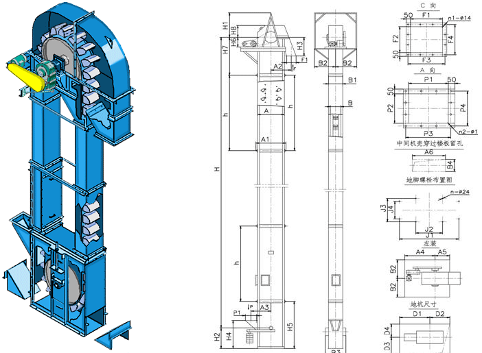2、斗提機(jī)的上部驅(qū)動(dòng)軸和下部張緊軸應(yīng)在同一垂直平面內(nèi)。