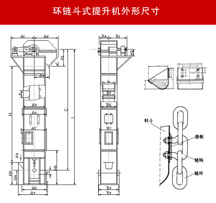 我公司生產的HL型環(huán)鏈離心斗式提升機,由運動部分(料斗與牽引鏈條)、帶有傳動鏈輪的上部區(qū)段、帶有拉緊輪的下部區(qū)段、中間機殼、驅動裝置、逆止制動裝置等組成。本提升機的料斗為間斷式布置,利用“掏取法”進行裝載,“離心投料法”卸料。HL型斗式提升機的牽引機構是兩根環(huán)形鏈條。
