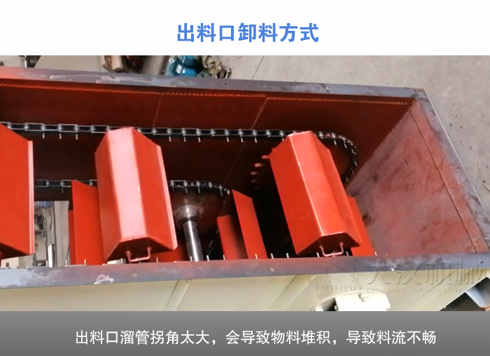 如果出料口溜管拐角太大,會導致物料堆積,導致料流不暢。所以,一般出料口會根據(jù)物料的特性進行設(shè)計,滿足用戶不同物料的使用。物料一旦粘性過大,當料斗達到斗式提升機頂部出料口時,粘在料斗內(nèi)部,使物料不拋出料斗或者流出料斗,終導致回料現(xiàn)象發(fā)生,發(fā)生堵料現(xiàn)象,降低斗式提升機的提升產(chǎn)量。