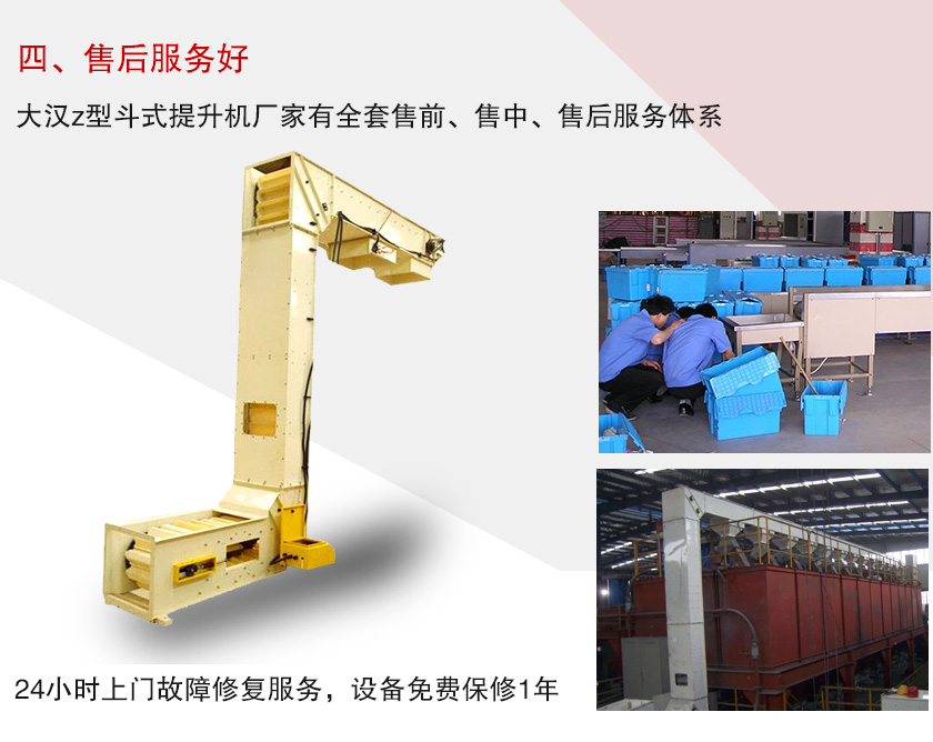 有些廠家在在設(shè)備賣出后就不負責(zé)后續(xù)事項,如設(shè)備故障維修,維護保養(yǎng)技巧培訓(xùn)等等,這樣會大大增加用戶的成本,大漢z型斗式提升機廠家有全套售前、售中、售后服務(wù)體系,設(shè)備售后環(huán)節(jié)我們有專門的售后服務(wù)人員實施跟蹤回訪,了解設(shè)備使用情況,并培訓(xùn)相關(guān)的維護保養(yǎng)方案,24小時上門故障修復(fù)服務(wù),設(shè)備免費保修1年。