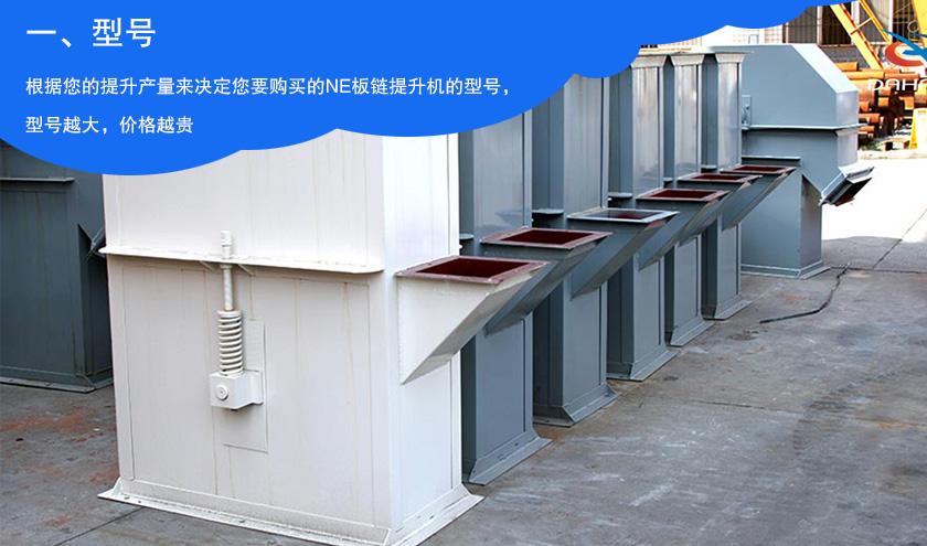 NE板鏈提升機(jī)的型號(hào):NE15、NE30、NE50 、NE100、NE150、NE200、NE300、NE400、NE500、NE600、NE800等多種,NE代表是板鏈提升機(jī),數(shù)字代表的是提升產(chǎn)量(方),所以可以根據(jù)您的提升產(chǎn)量來(lái)決定您要購(gòu)買的NE板鏈提升機(jī)的型號(hào),型號(hào)越大,價(jià)格越貴。