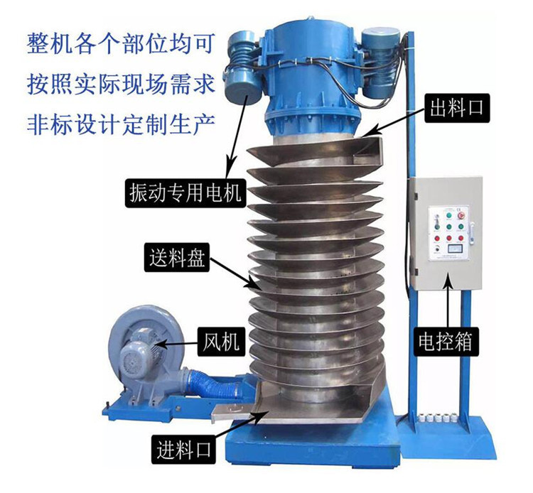 垂直振動(dòng)提升機(jī)是一種垂直振動(dòng)輸送設(shè)備,本機(jī)顆粒狀、塊狀、粉狀的固體物料(粘度不)都可以輸送。廣泛應(yīng)用于礦山、冶金、機(jī)械、建材、化工、橡膠、醫(yī)藥、電力、糧食、食品等行業(yè)的塊狀、粉狀和短纖維狀固體物料的提升,DZC型振動(dòng)輸送機(jī)在向上提升物料的同時(shí),還可以完成對(duì)物料的干燥和冷卻。分開槽式、封閉式兩種結(jié)構(gòu),并可根據(jù)不同的工藝要求,設(shè)計(jì)物料顆粒分級(jí)作用的篩選提升機(jī)及設(shè)計(jì)易燃易爆物料的提升機(jī)。 垂直振動(dòng)提升機(jī)工作原理: